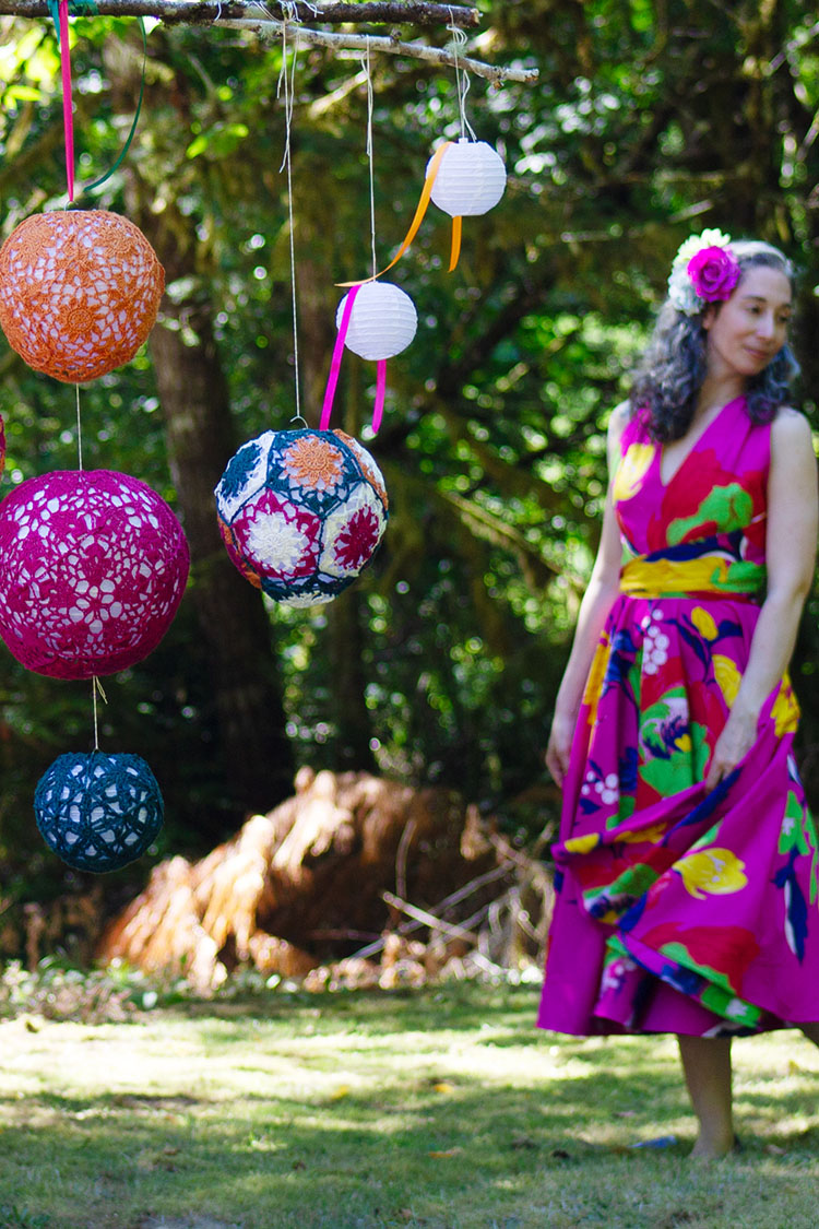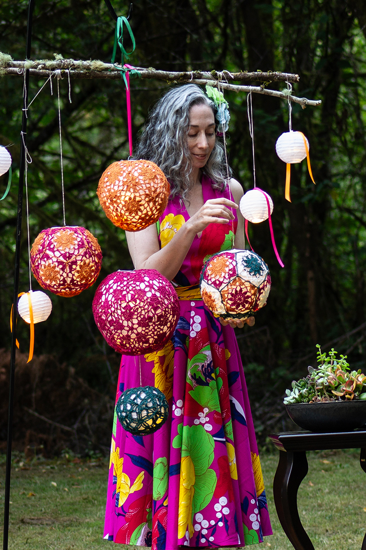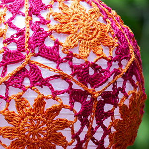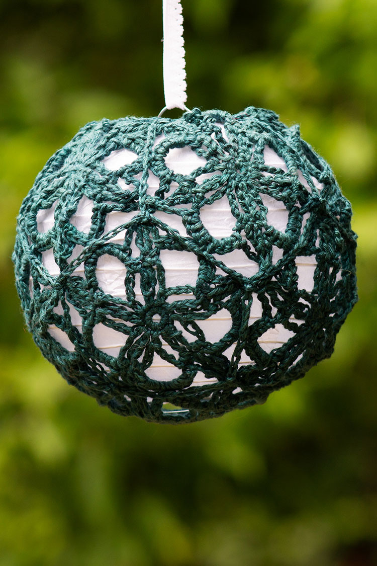 I've included some approximate yardage estimates, and motif sizes, but none of this needs to be exact. Measure your test motif after blocking (see notes below) across the widest point, and multiply by 5 to determine the circumference of your finished project. The larger two sizes are both 5% smaller than the actual lanterns, and I could have gone a little smaller without any issues.