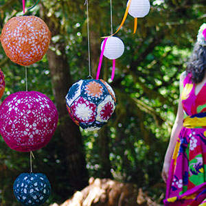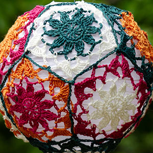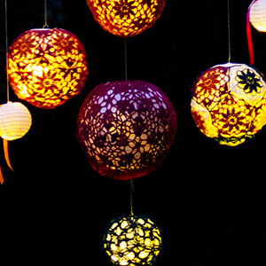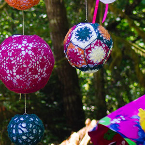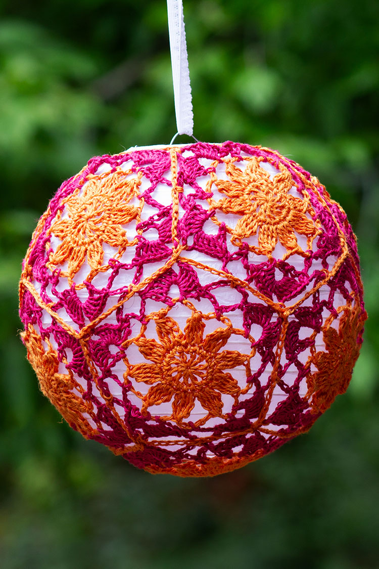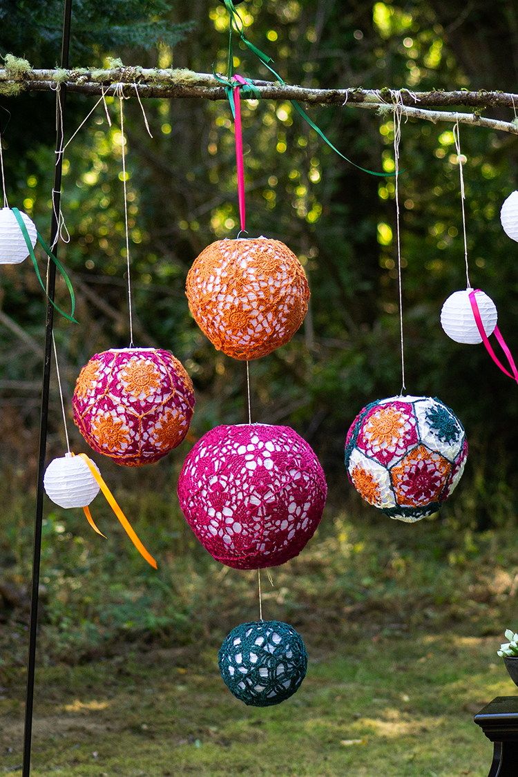 Each lantern is comprised of eleven pentagons assembled over a paper lantern. There are three diameters: 10 inches/ 25.5 cm, 8 inches / 20 cm, and 6 inches / 15 cm.
