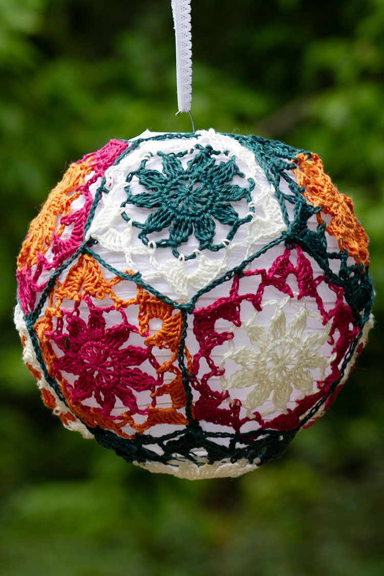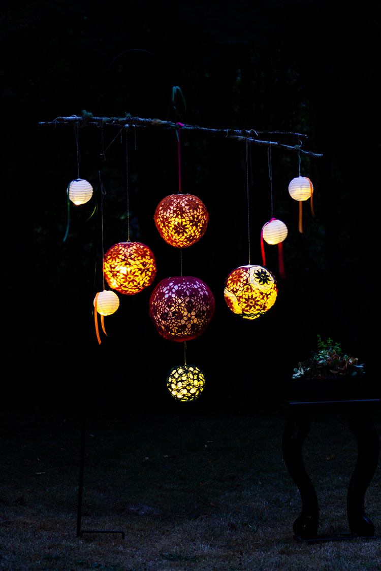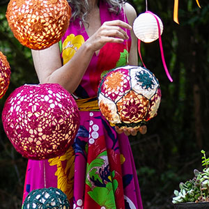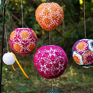 Each lantern is comprised of eleven pentagons assembled over a paper lantern. There are three diameters: 10 inches/ 25.5 cm, 8 inches / 20 cm, and 6 inches / 15 cm.