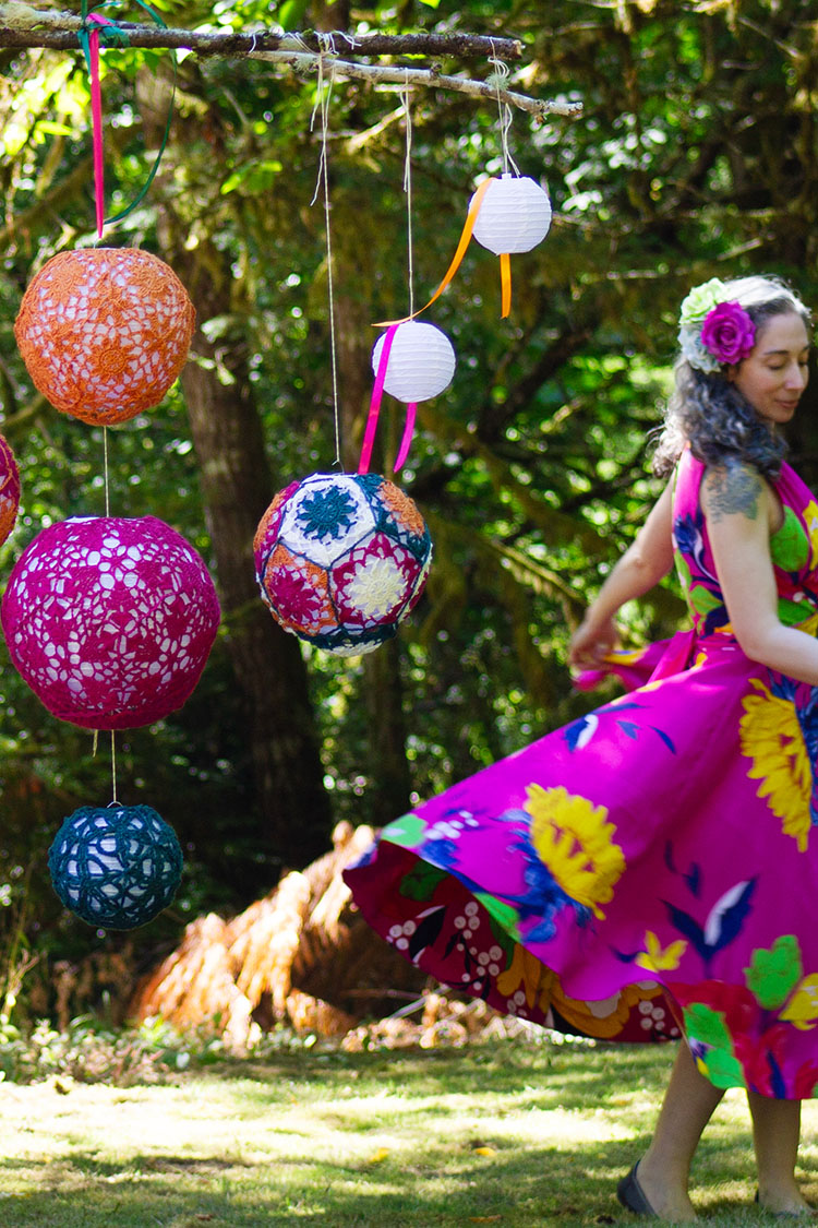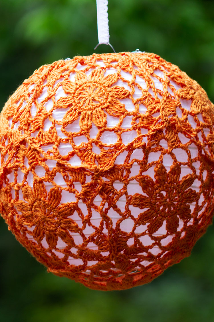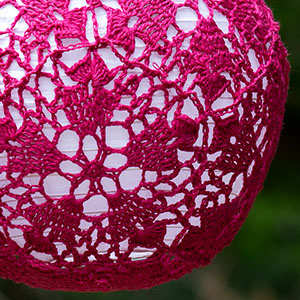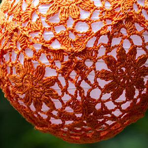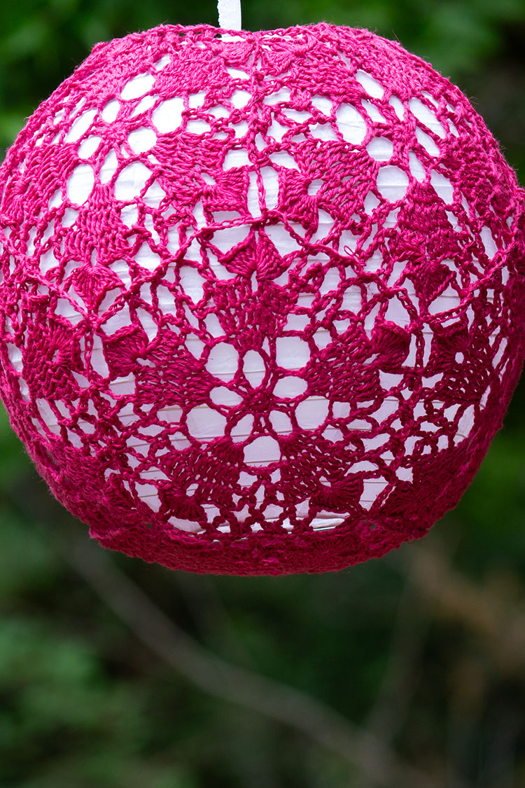 I've included some approximate yardage estimates, and motif sizes, but none of this needs to be exact. Measure your test motif after blocking (see notes below) across the widest point, and multiply by 5 to determine the circumference of your finished project. The larger two sizes are both 5% smaller than the actual lanterns, and I could have gone a little smaller without any issues.